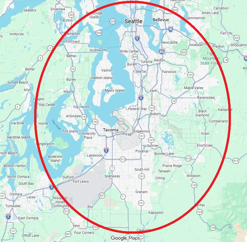 I'm located in the Tacoma area and serve most areas within 45 minutes of Tacoma including: